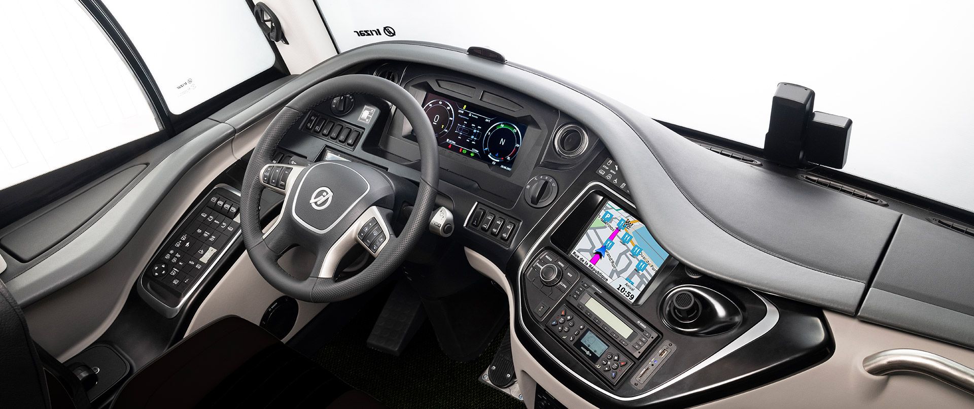 In addition to having a large space, drivers have an optimal field of vision, and even more so in the Irizar i6S Efficient model where the mirrors can be replaced by a digital camera system that provide a panoramic view under all condition and in all situations, either at night or in the rain.