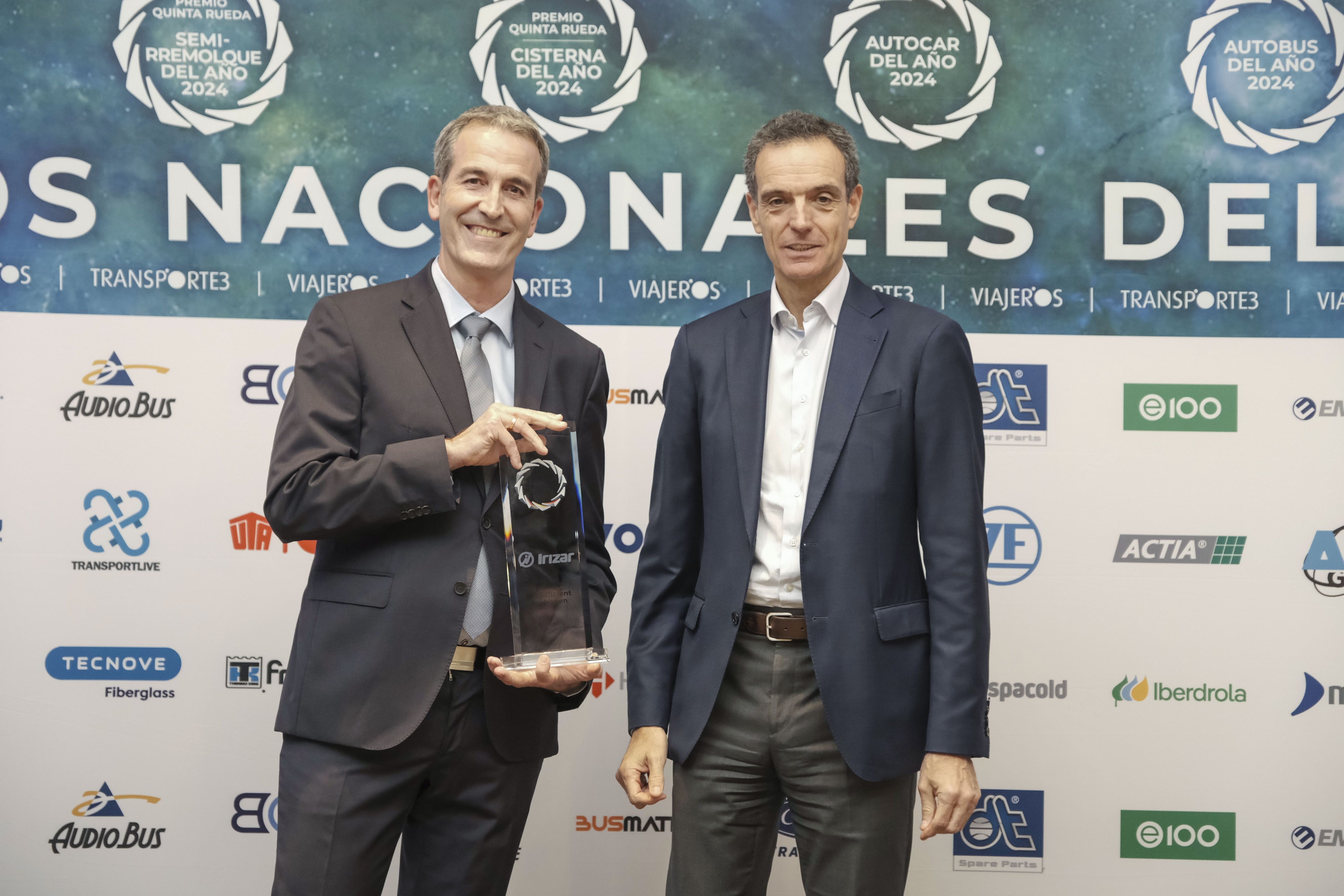 Imanol Rego, CEO of the Irizar Group, and Mikel Perez, the Irizar Commercial Director for Spain and Portugal, received the prize at the awards ceremony that was held yesterday, Wednesday 24 January at the Madrid Novotel Hotel. The event brought together businesspeople from the sector, members of the main industry associations and institutional representatives.