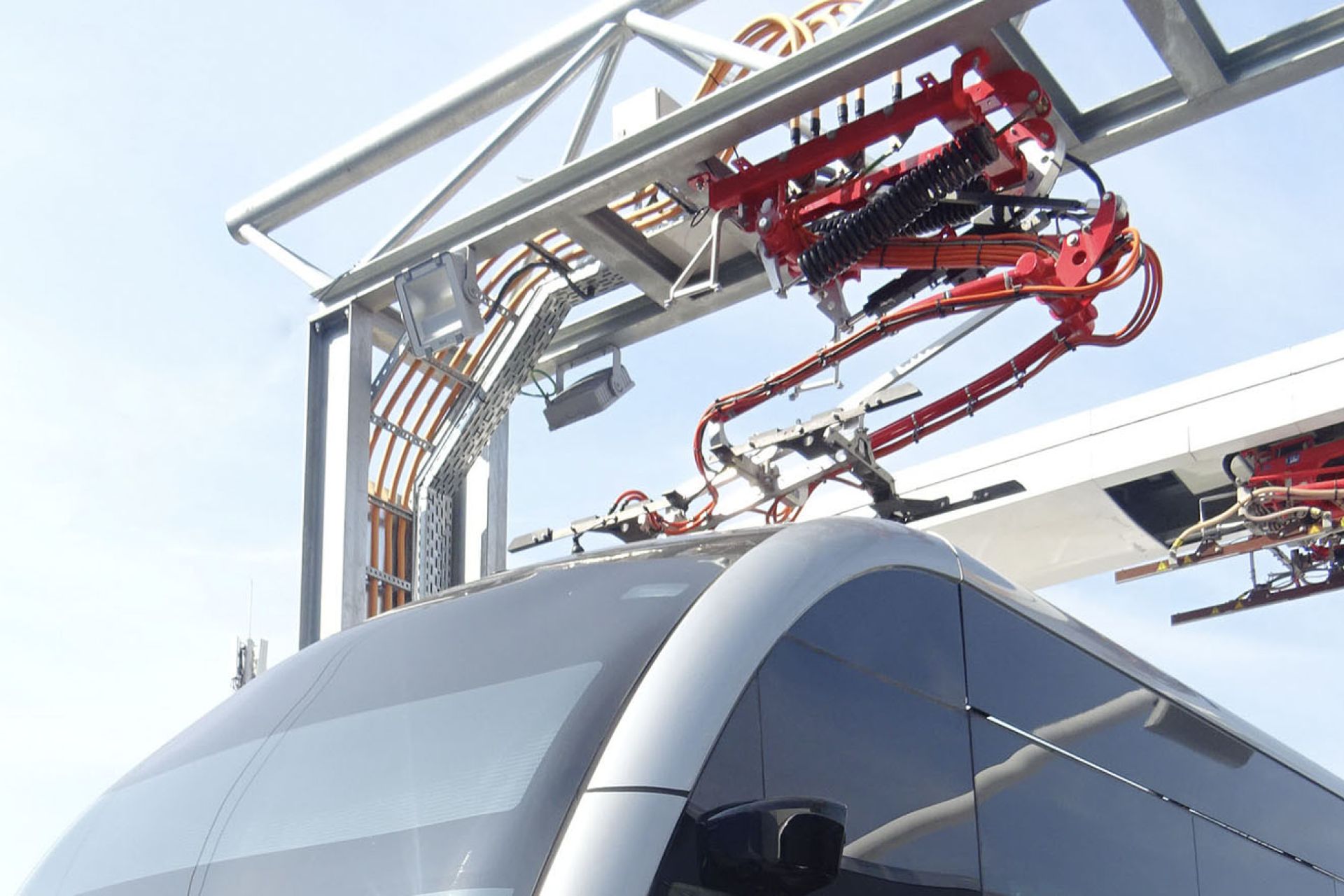The moving part of the pantograph is integrated into the post of the charging infrastructure. The vehicle only needs a complementary part to be able to charge. The vehicle is charged in a few minutes.